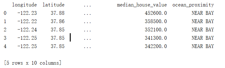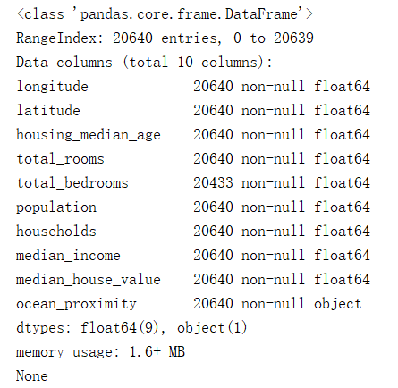 所有属性的字段都是数字,除了ocean_proximity。它的类型是object,因此它可以是任何类型的python对象。