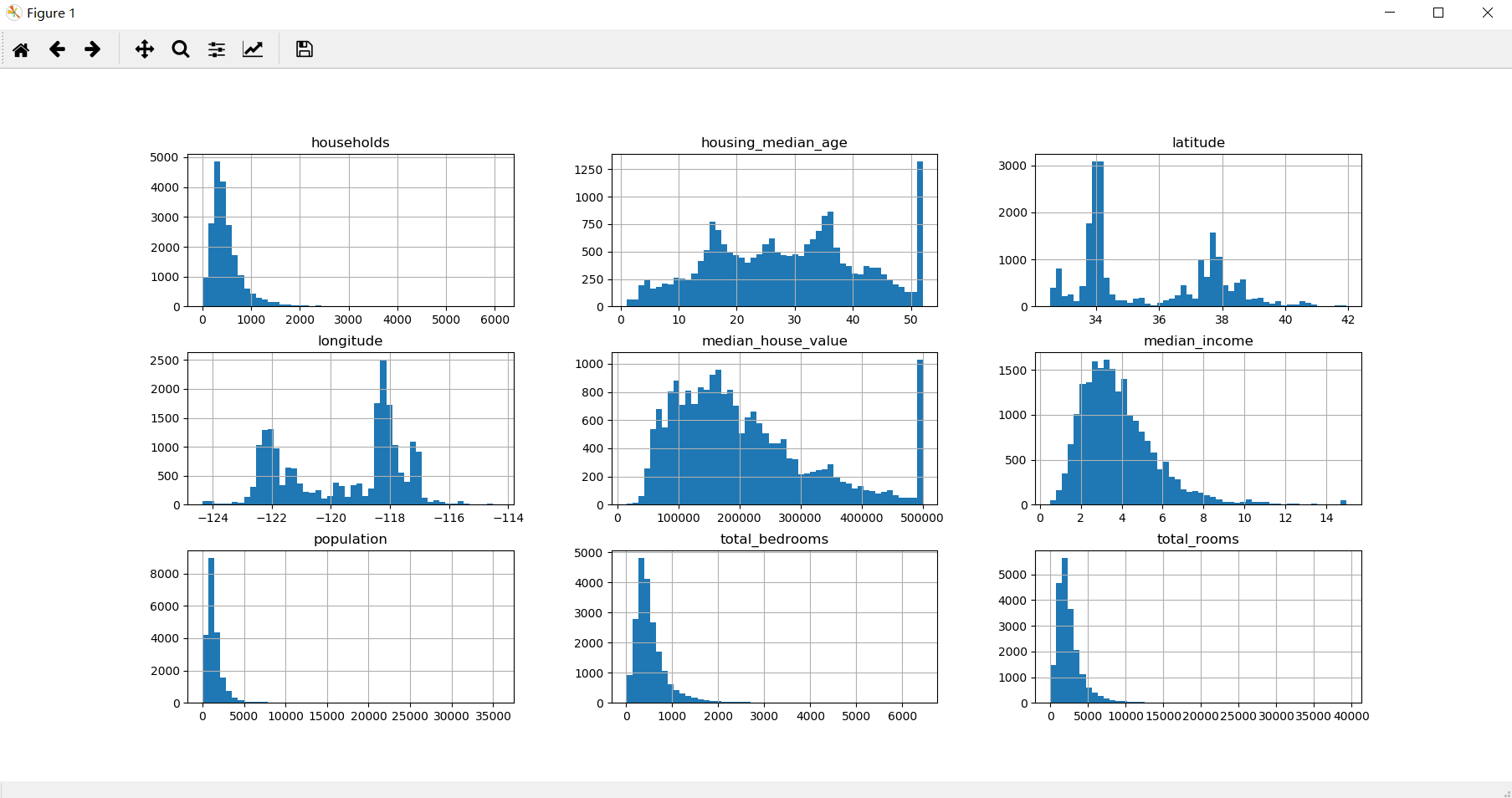数据集中包含20640个实例,以机器学习的标准来看,这个数字非常的小,但却是个完美的开始,需要注意的是,total_bedrooms这个属性只有20433个非空值,这意味着有207个区域缺失这个特性。我们后面需要考虑这一点。